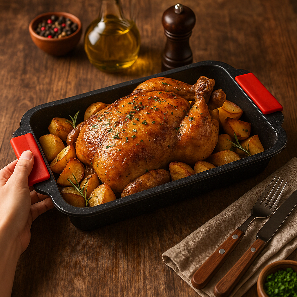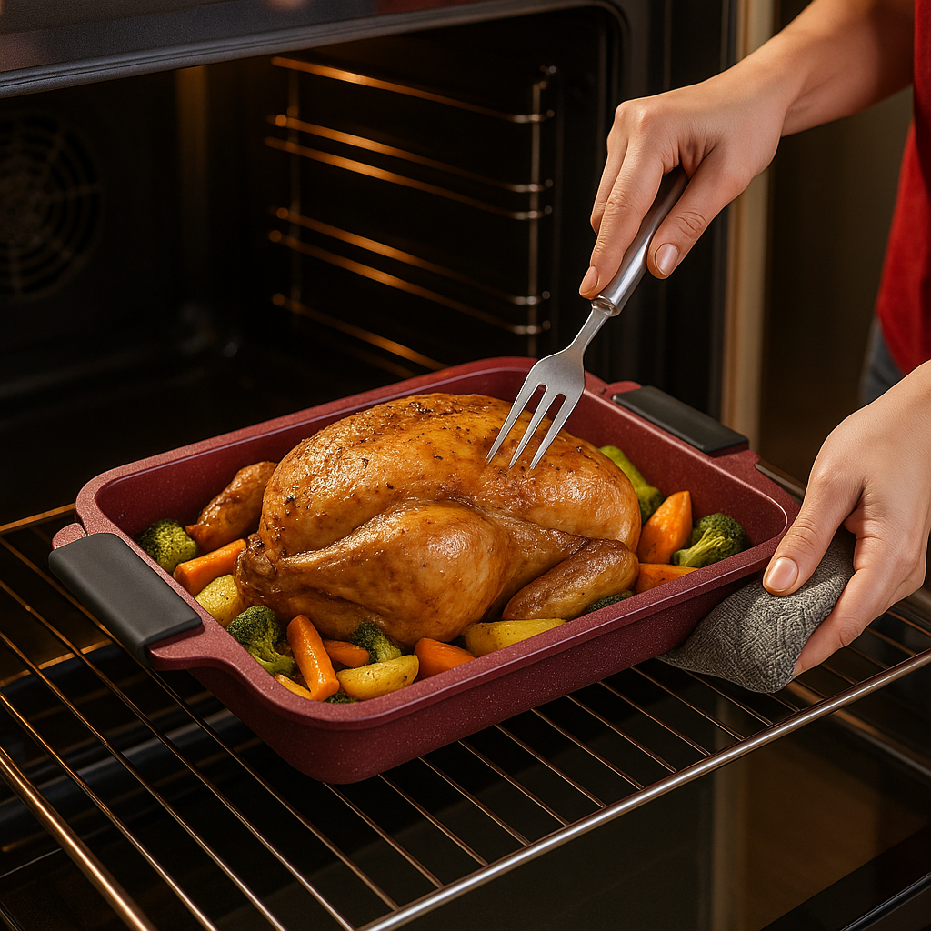 A hőálló szilikon markolatoknak köszönhetően biztonságosan és kényelmesen veheted ki a tepsit a sütőből, égési sérülések nélkül.