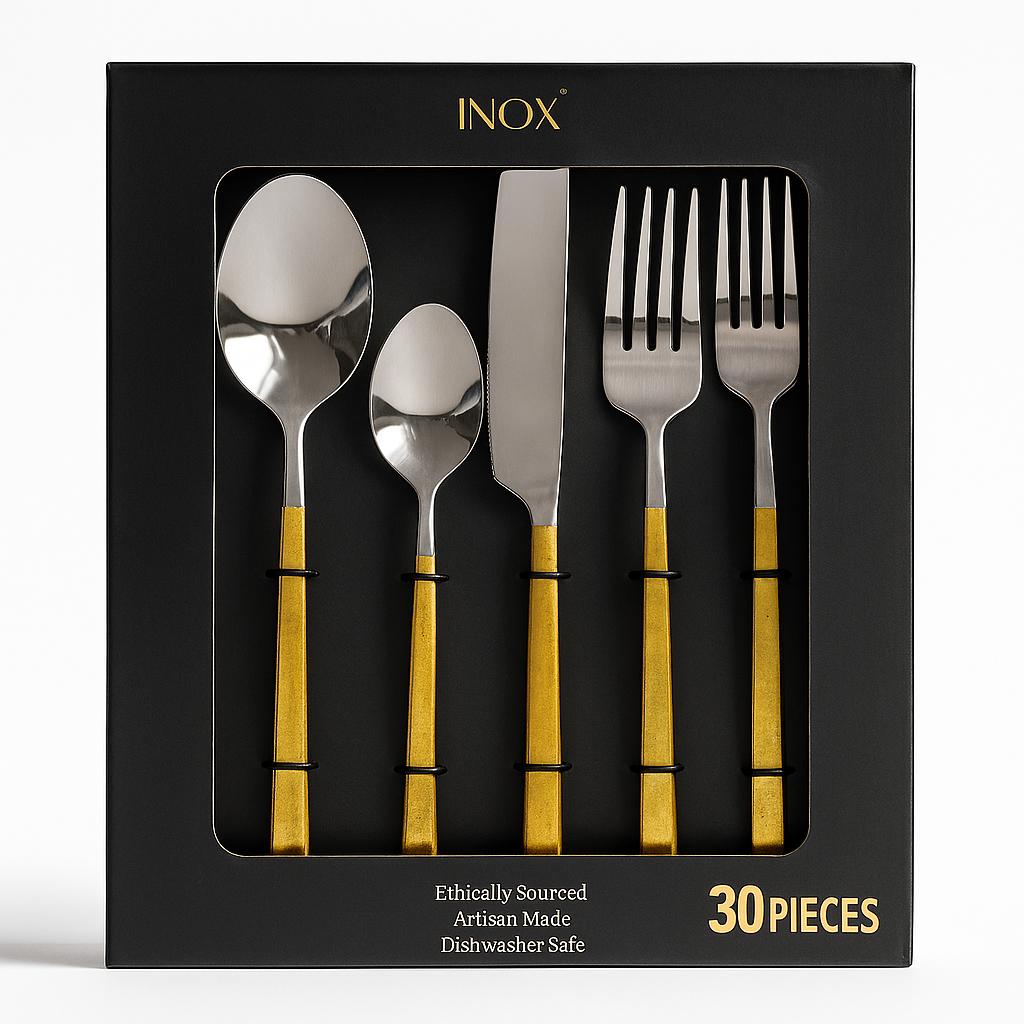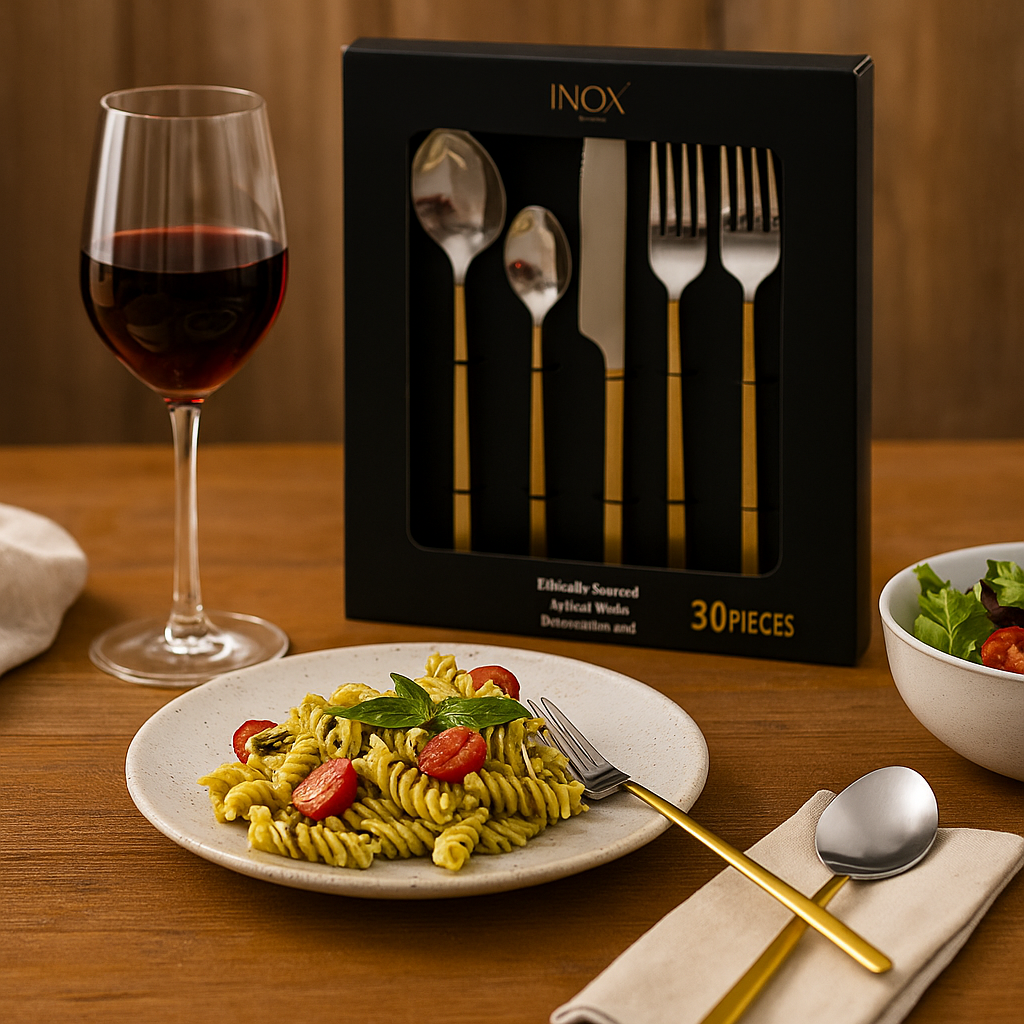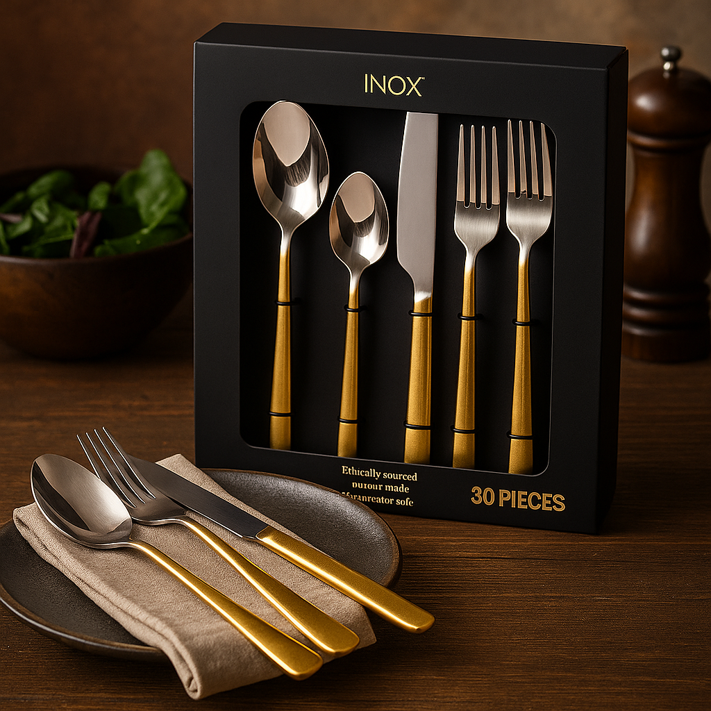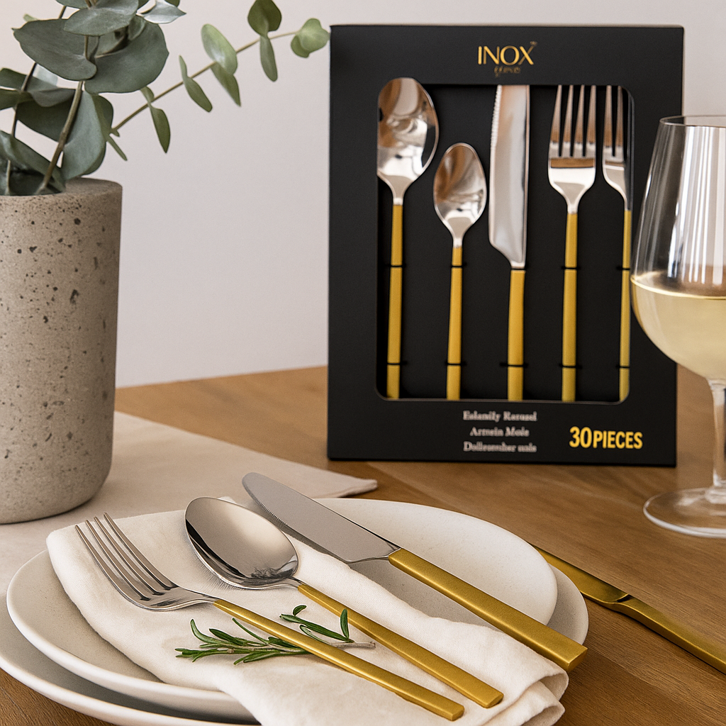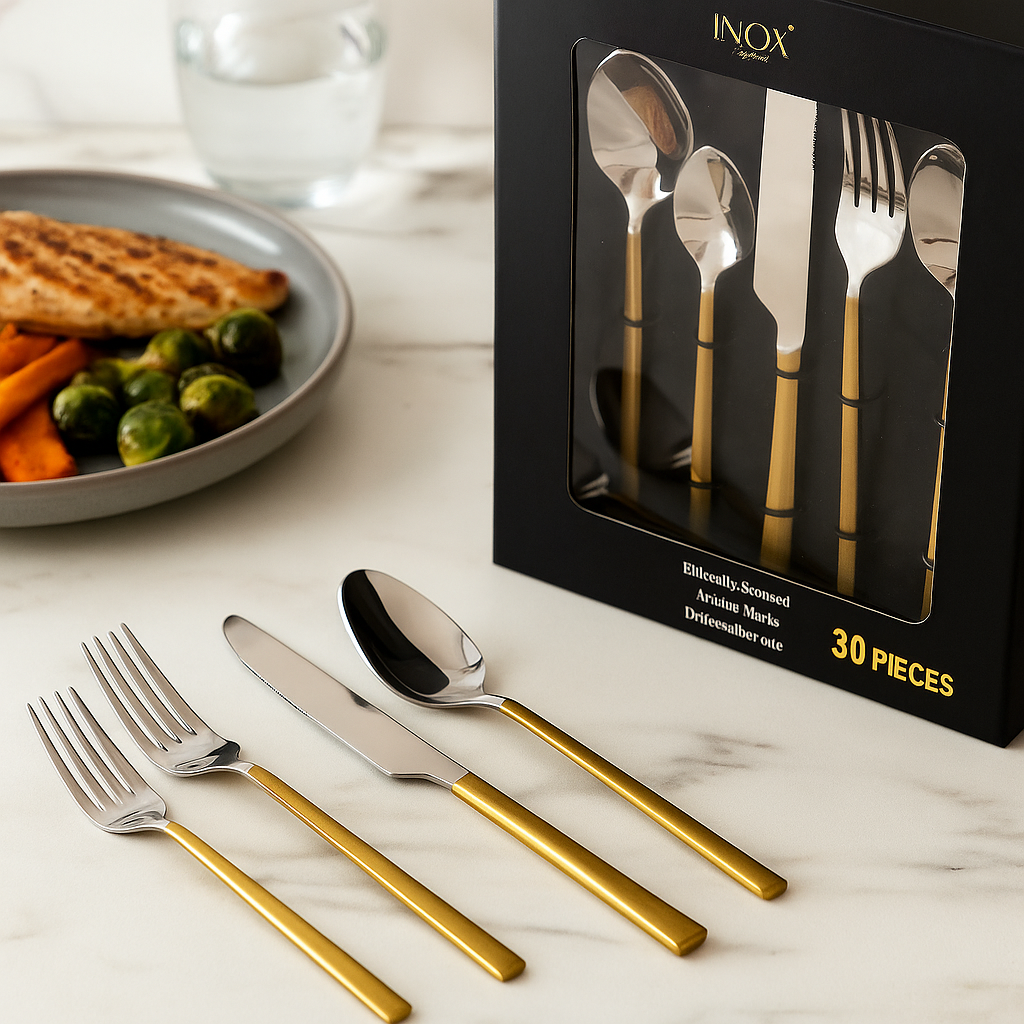 🍽️ 30 Darabos Aranyszegélyes Evőeszköz Készlet – Prémium Rozsdamentes Acél | Luxus Dizájn | Mosogatógépben Mosható