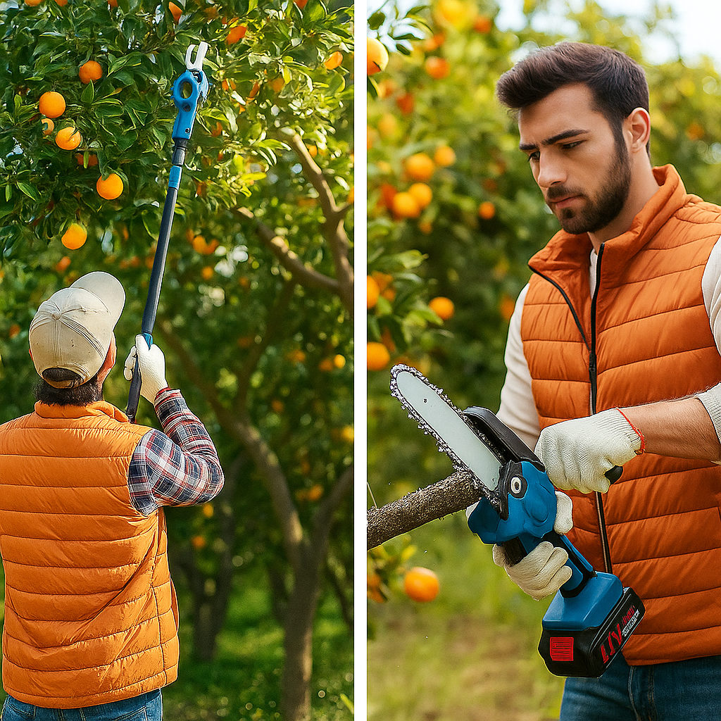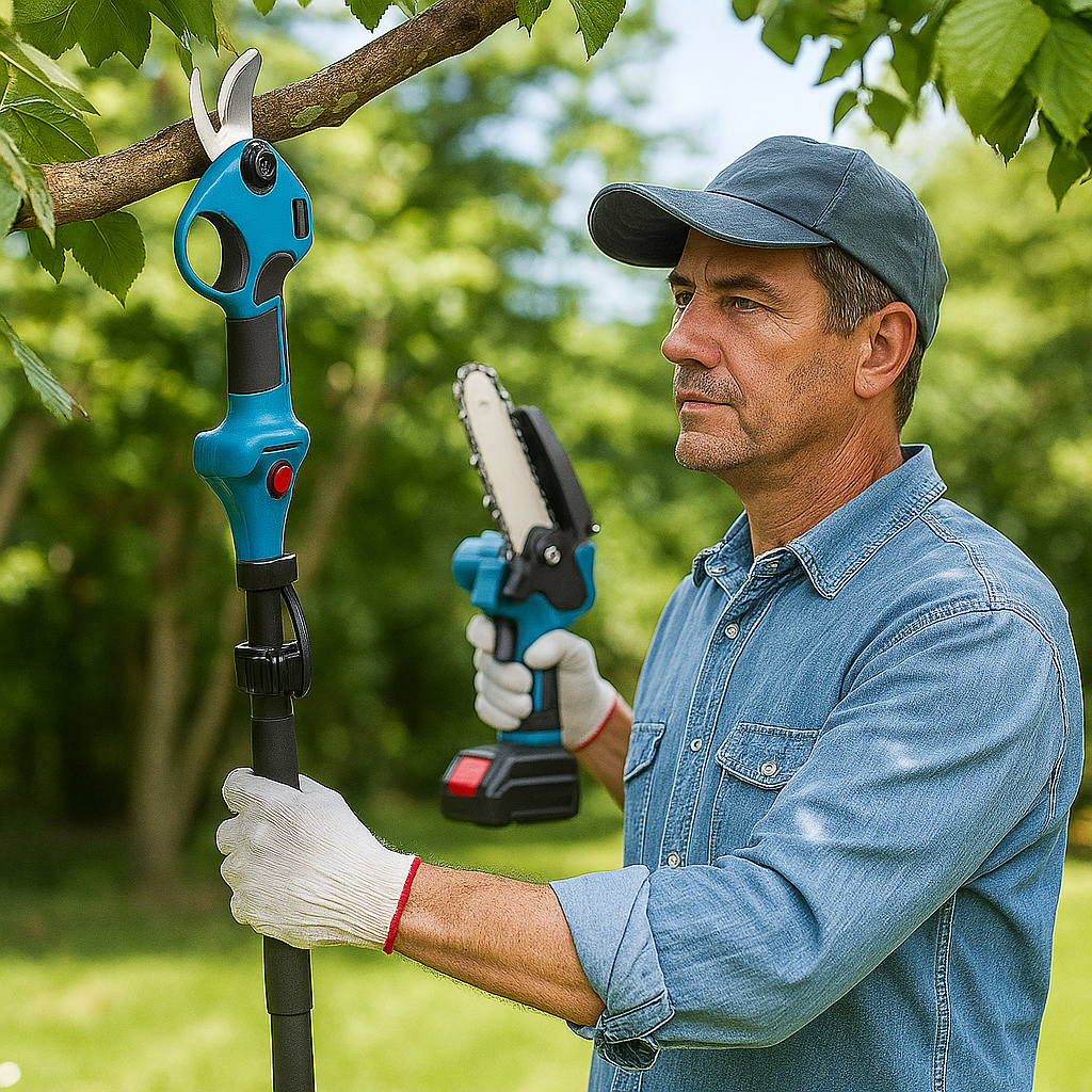 🔹 Kettős funkció – 2 az 1-ben rendszer: Láncfűrész és metszőolló egy szettben