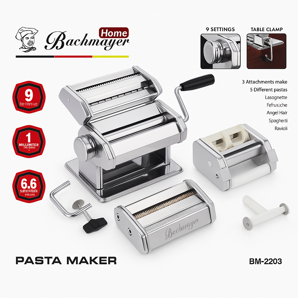 A Bachmayer Home BM-2203 tésztagép 9 fokozatban állítható vastagsággal, prémium rozsdamentes acél kivitelben, és 5 féle tészta elkészítésére alkalmas – lasagne, fettuccine, angel hair, spagetti, ravioli – mind egyetlen géppel!