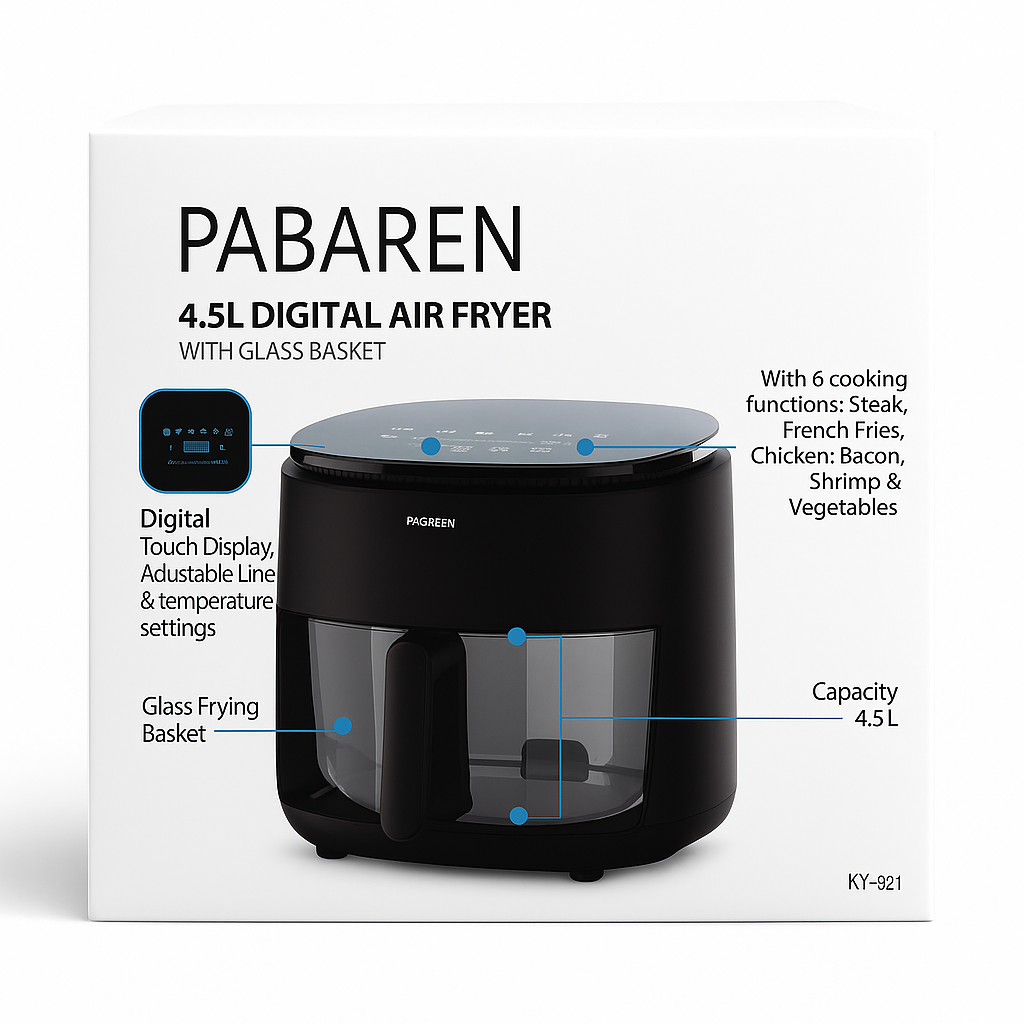 🍟 Digitális Forrólevegős Sütő Üvegkosárral – 4,5L Kapacitás | 1500W Teljesítmény | 6 Automata Program | Egészséges, Olajmentes Főzés