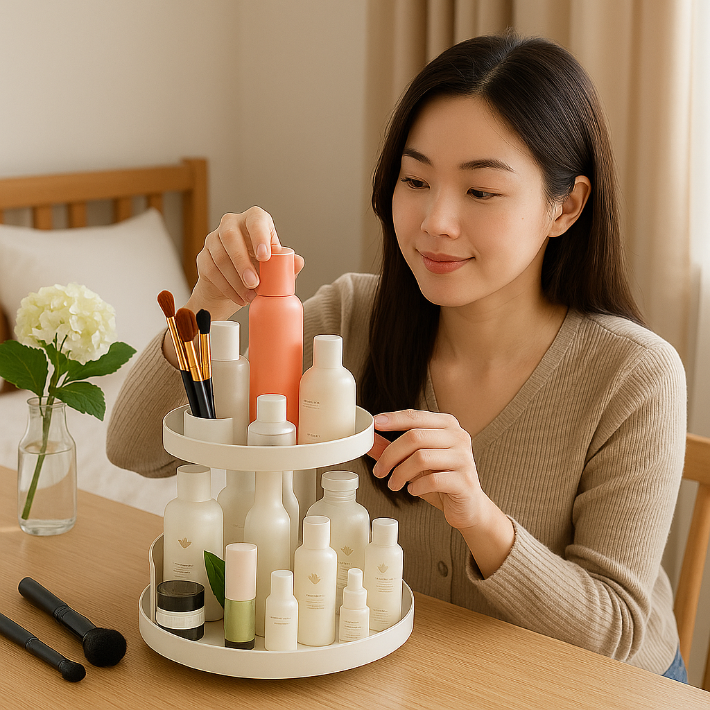 Forgatható Kozmetikai Rendező – Tökéletes Rend és Elegancia az Asztalon!