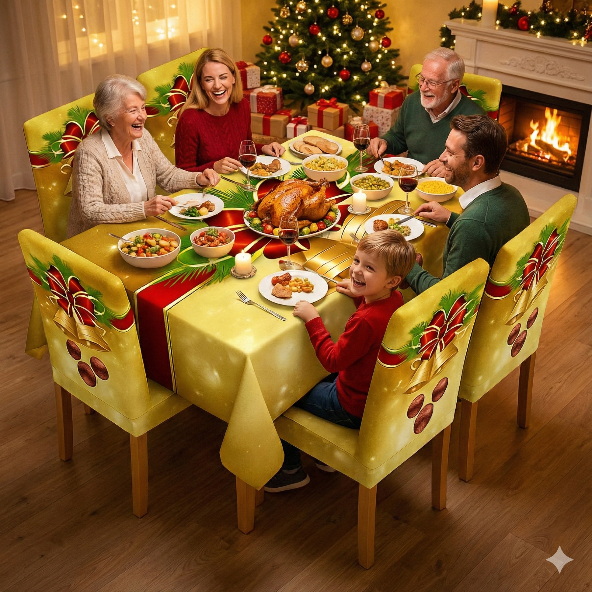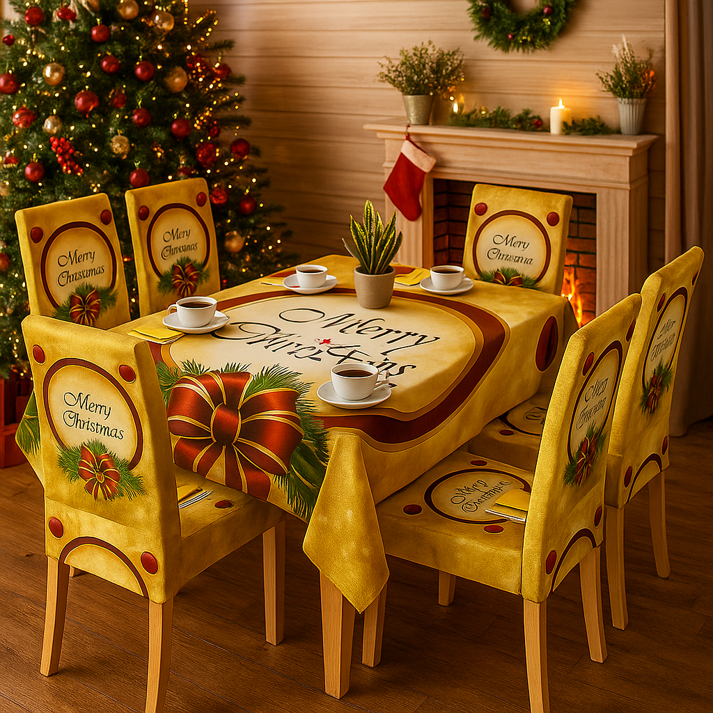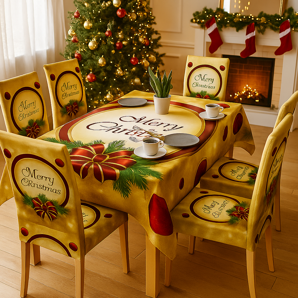 🎄 Karácsonyi 7 Részes Asztalterítő és Székhuzat Szett – Luxus Hangulat, Azonnali Ünnepi Varázslat Otthonodban