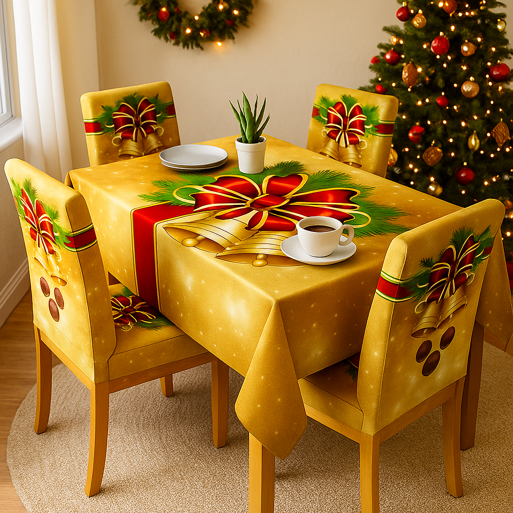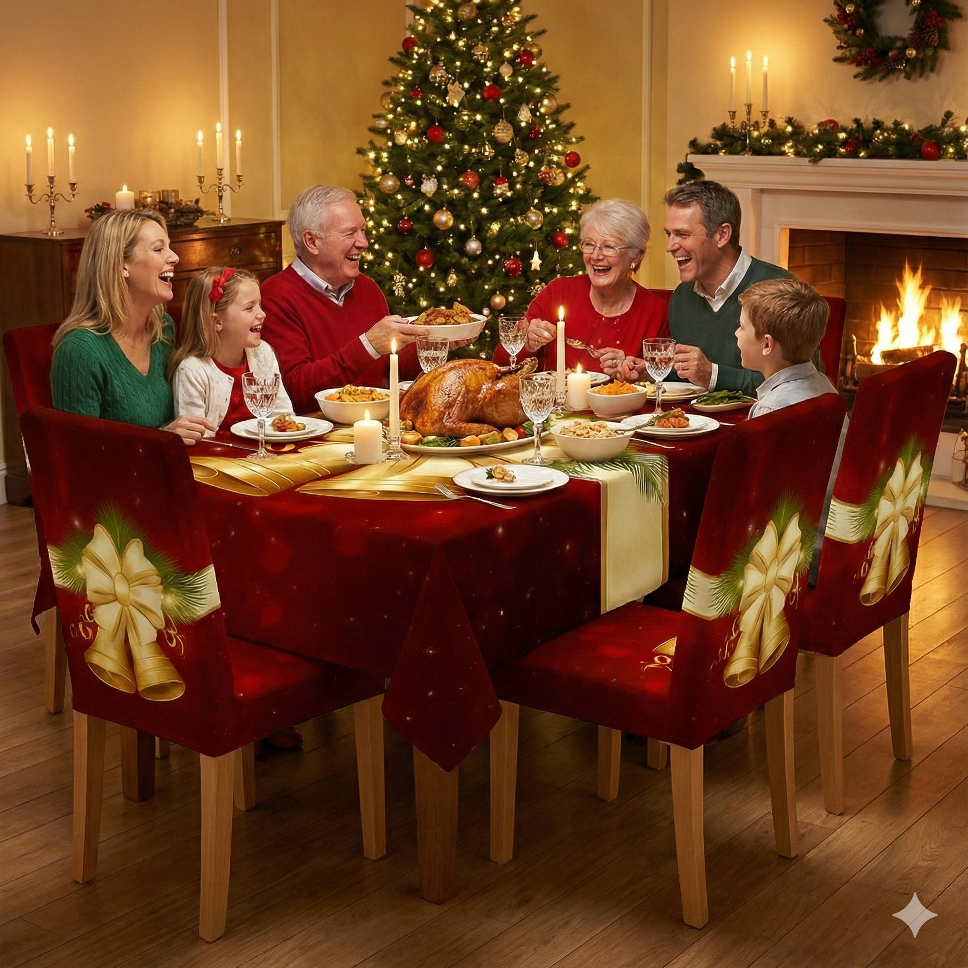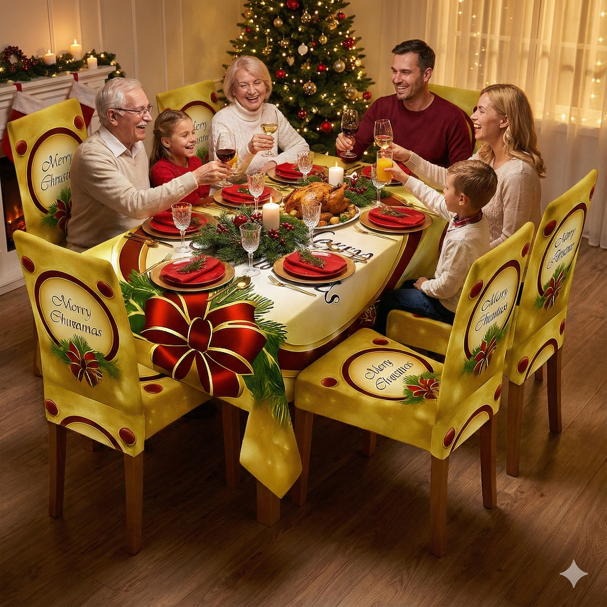 🎄 Karácsonyi 7 Részes Asztalterítő és Székhuzat Szett – Luxus Hangulat, Azonnali Ünnepi Varázslat Otthonodban