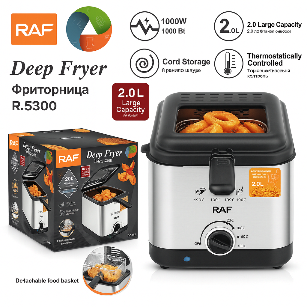 🍟 RAF R.5300 – 2.0L Prémium Olajsütő | 1000W teljesítmény, termosztátos hőfokszabályzás, rozsdamentes acél ház