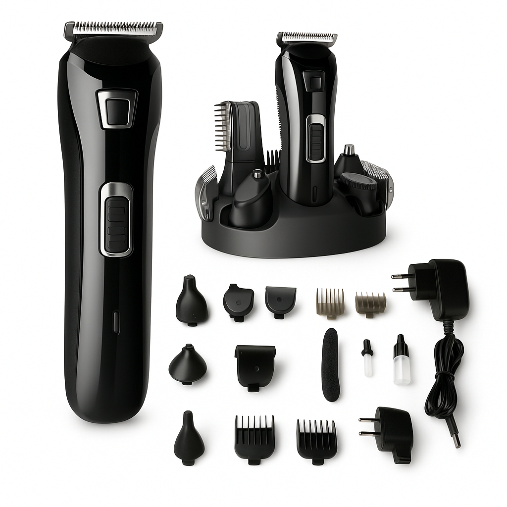 - Széleskörű Alkalmazhatóság: A szett tartalmaz 6 cserélhető trimmelő fejet, amelyek alkalmasak az arc- és testszőrzet, valamint a haj nyírására és formázására.