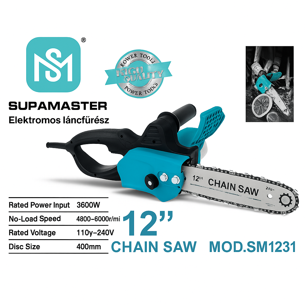 Supamaster Elektromos Láncfűrész SM1231 – 3600W Teljesítmény, 12” Penge, Maximális Hatékonyság!