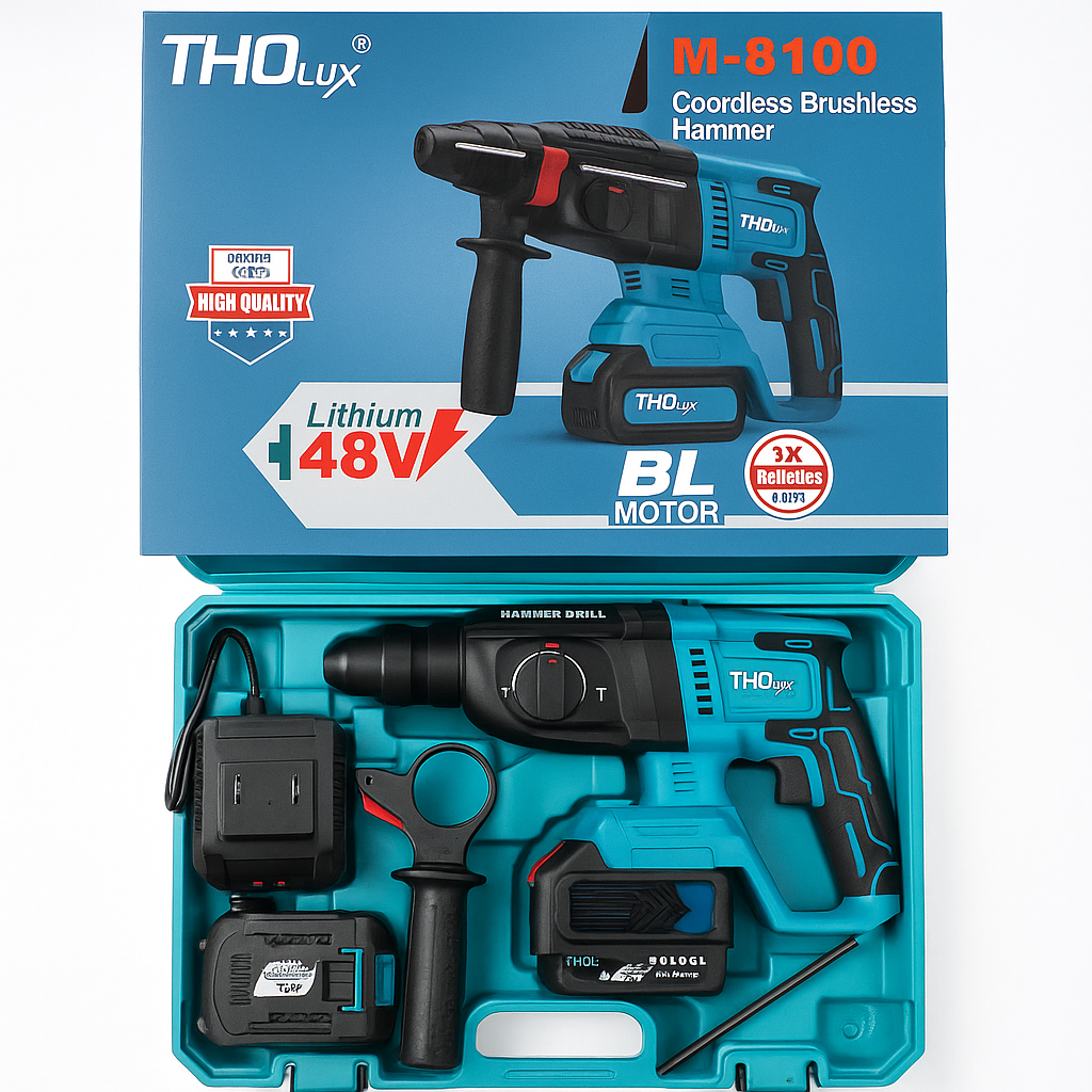 A THOlux M-8100 akkus, kefe nélküli ütvefúró és kalapácsfúró a legújabb generációs, professzionális teljesítményt nyújtó szerszám, amelyet úgy terveztek, hogy a legkeményebb kihívásokat is könnyedén teljesítse.